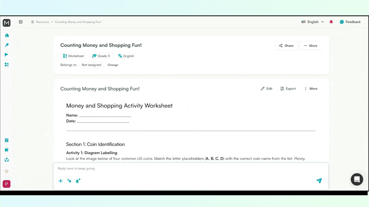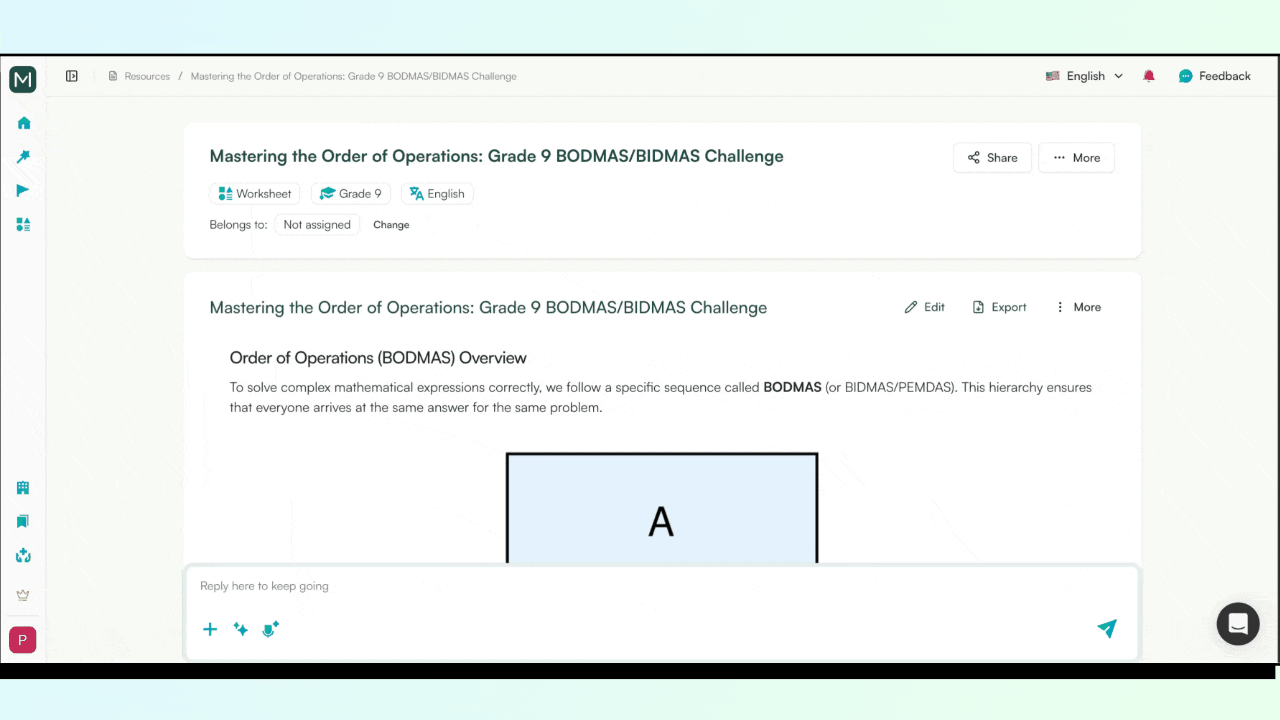 The platform is an end-to-end AI teaching assistant that helps you with resource creation, editing and export. Just like many other teaching resources, you can create a Math worksheet with Monsha.