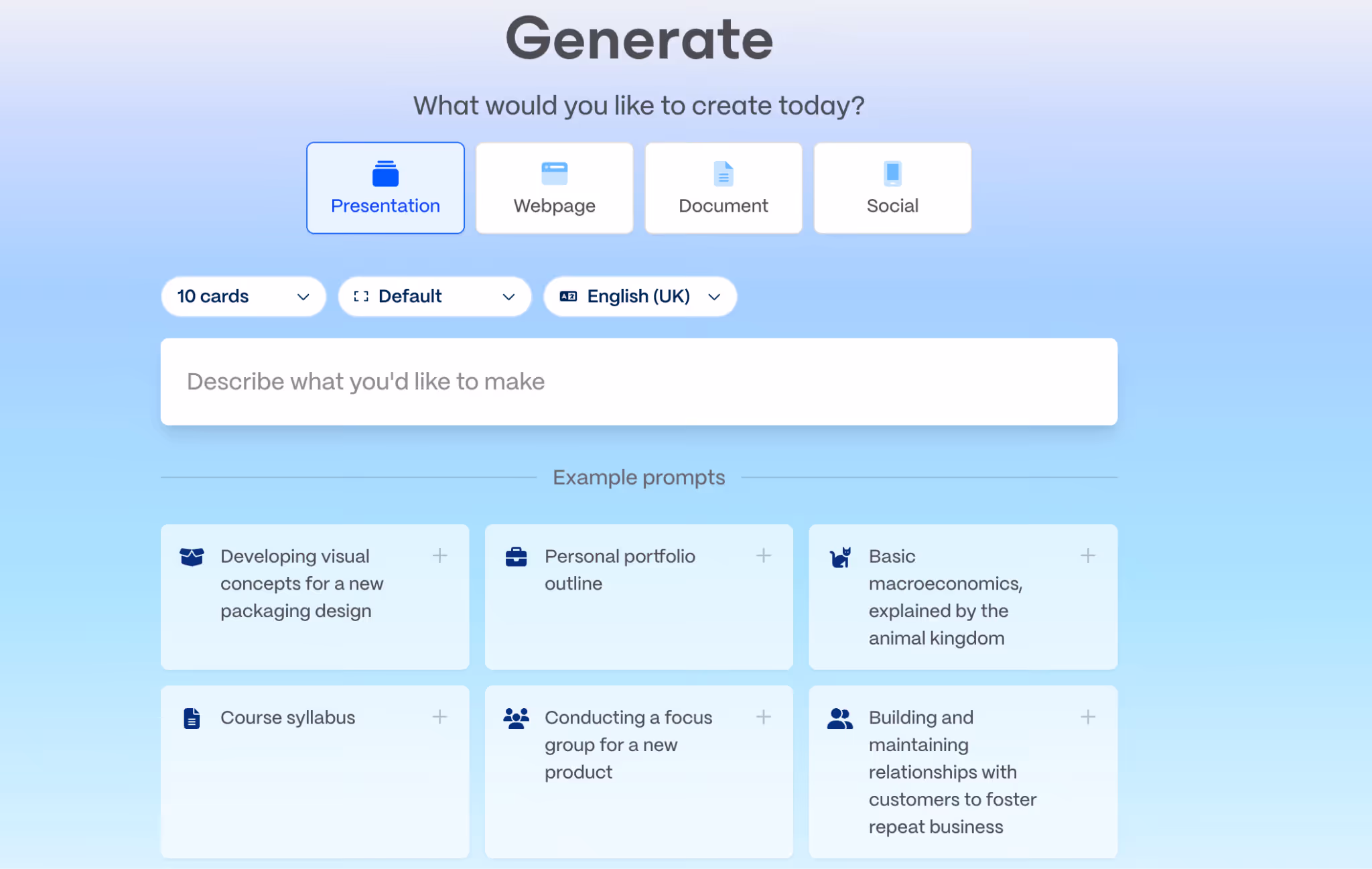If you choose to generate a presentation with AI, you’ll enter the ‘Editor’ where you can type in a prompt or choose from example prompts.