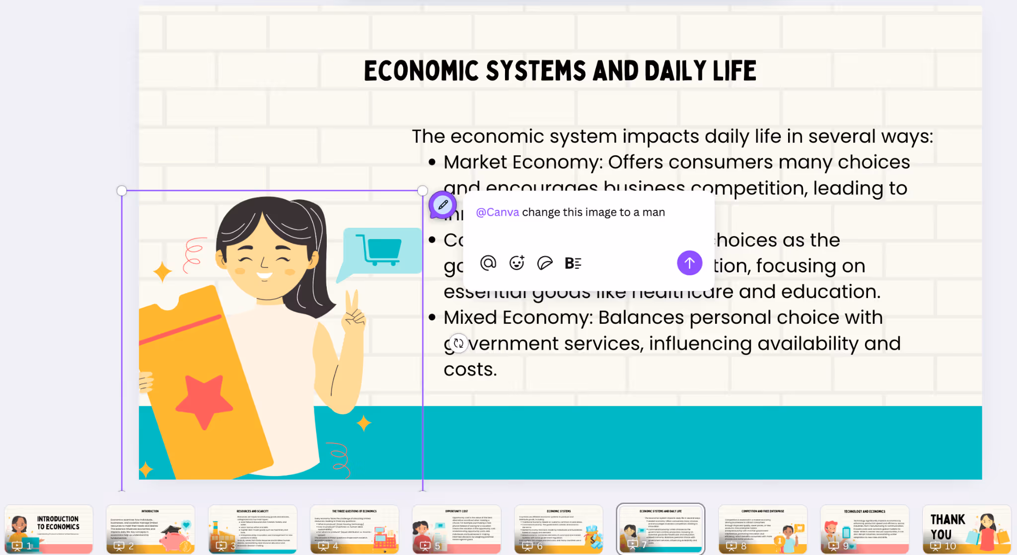 At this point, you’ll get a pre-made presentation. You can edit the content and images by writing simple prompts. You can also upload more photos, graphics, or videos.