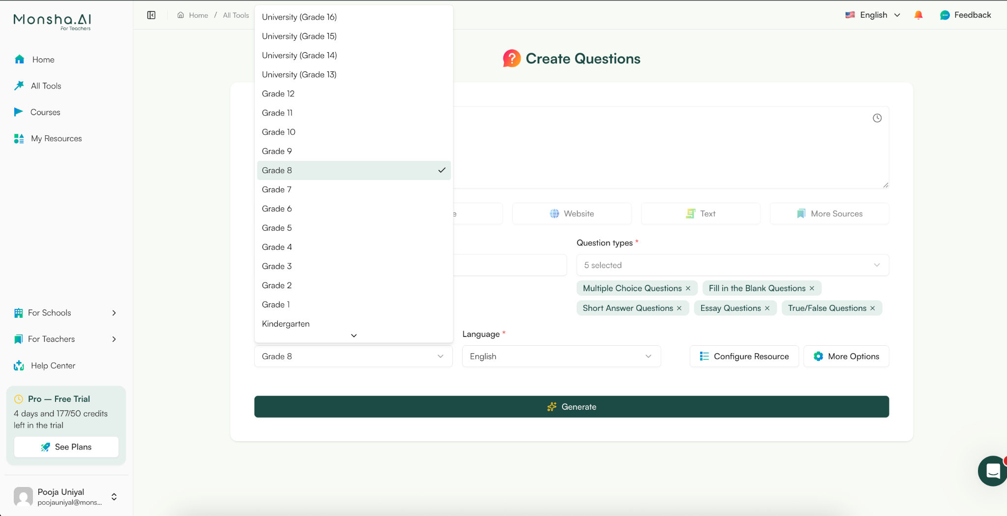 Next, specify the grade and language. This ensures the questions match your students’ reading level and curriculum expectations, especially useful when you’re creating quizzes for mixed-ability classrooms.