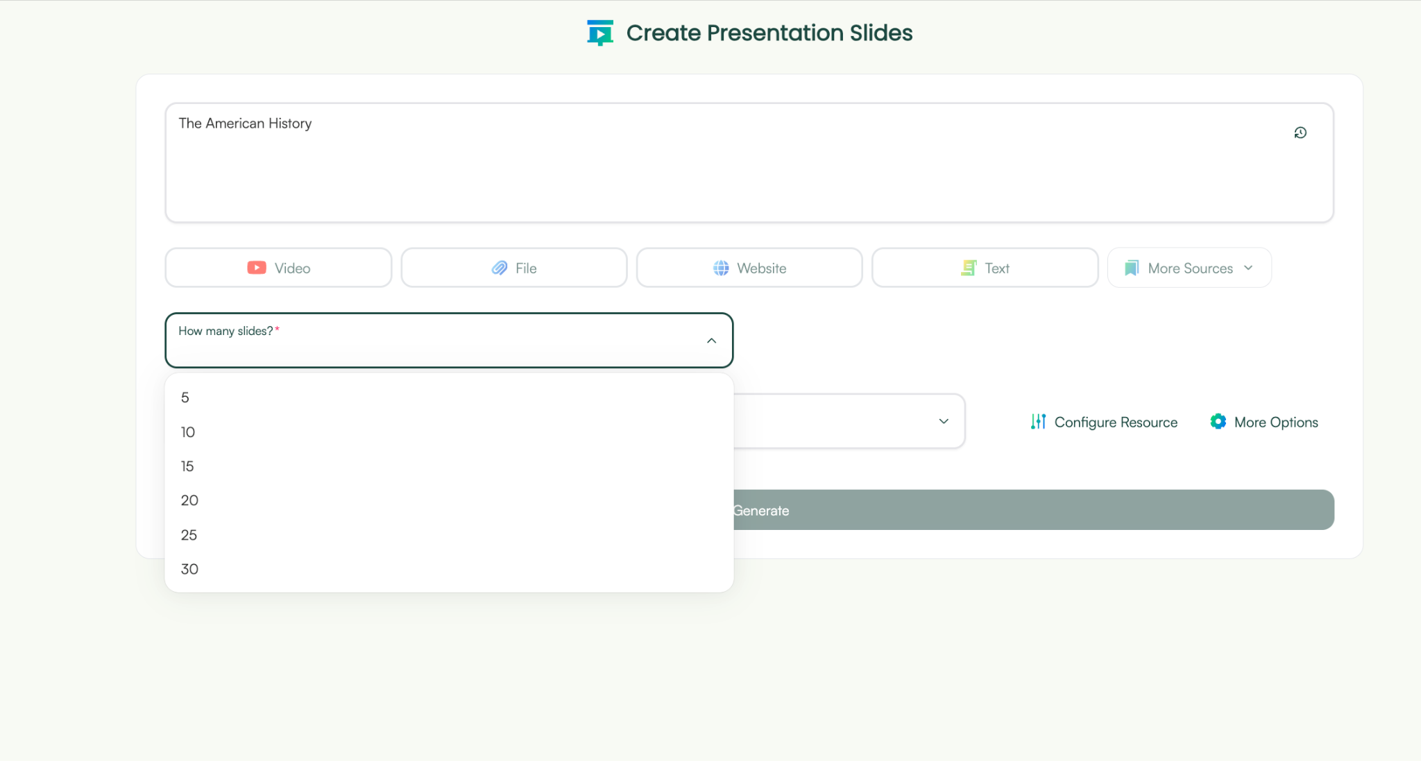 Now choose the number of slides. Whether you want a short intro deck or a full classroom presentation, this controls how detailed your AI-generated slides will be.