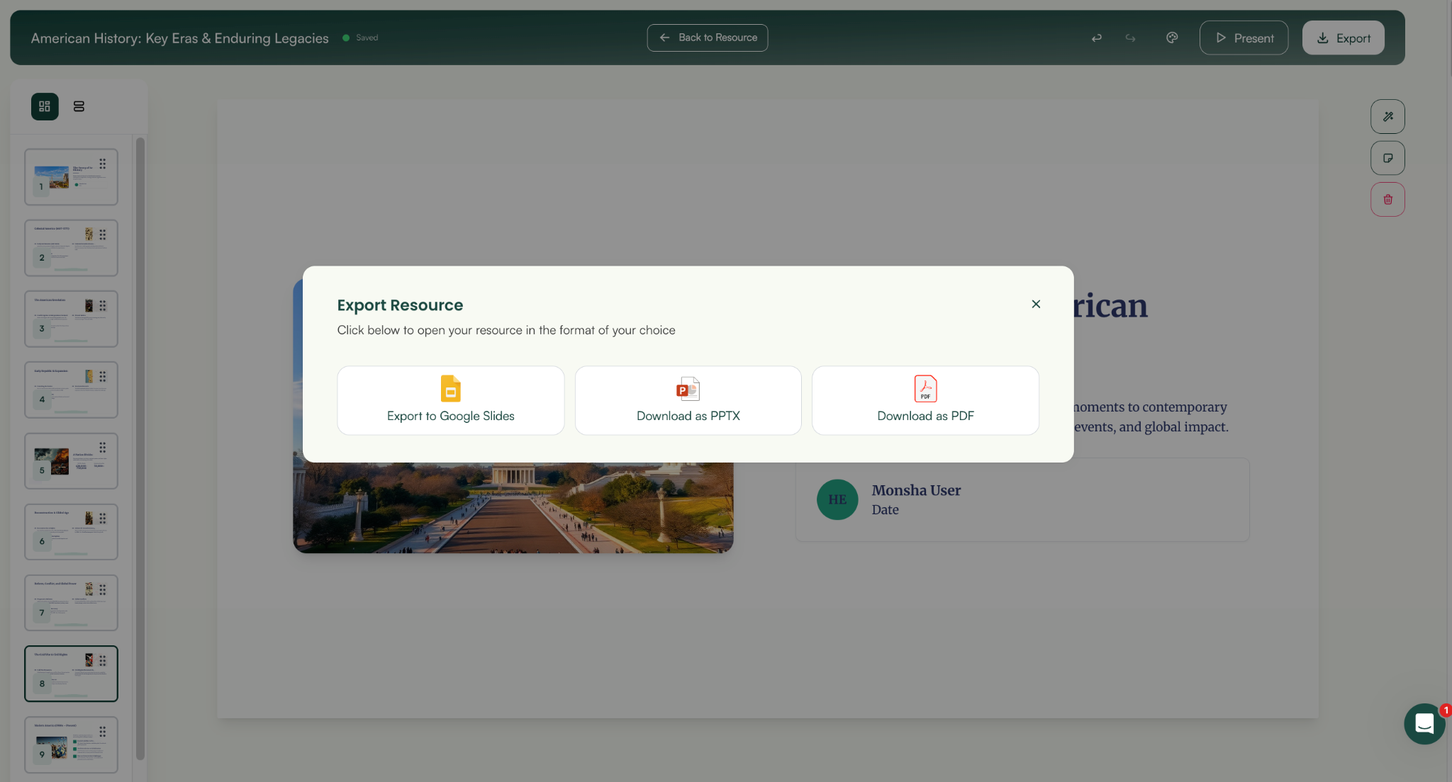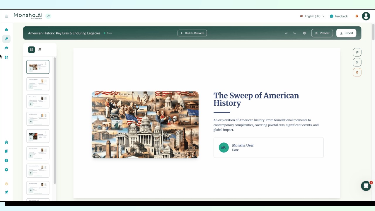 Most AI presentation makers stop once the slides are generated. Monsha doesn’t. It gives you full control to refine, adapt, and build on your presentation, so it actually works in a real classroom.
