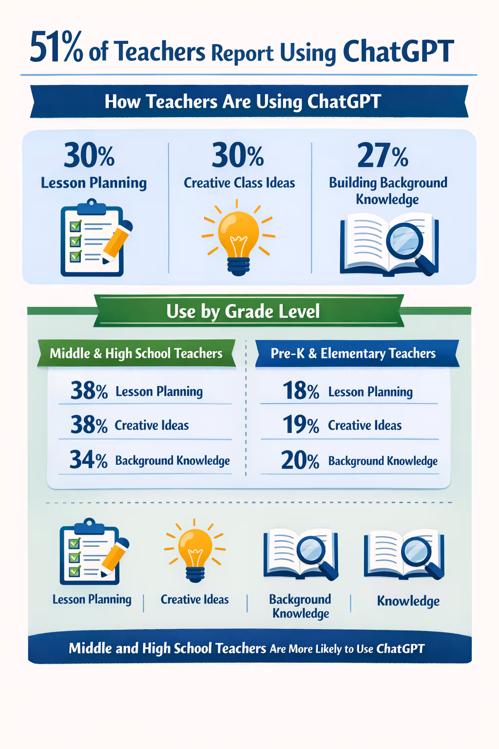 ChatGPT is most commonly used by teachers in middle school, high school, and higher education. For younger grades, teachers tend to use it behind the scenes for planning and material creation rather than direct student use.