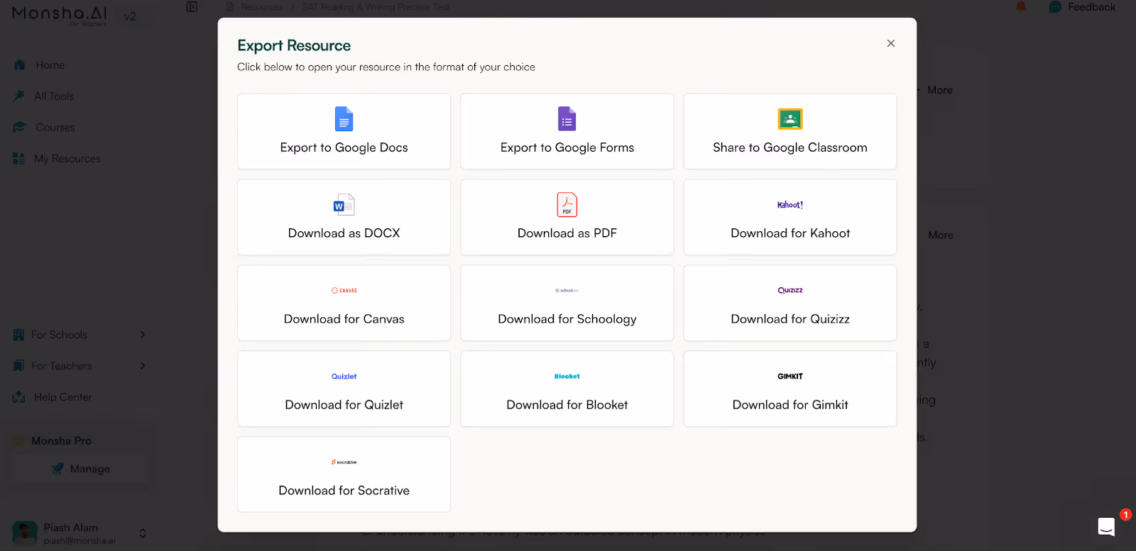 Monsha is built for the school ecosystem. While ChatGPT can only export as a PDF or .xsv file, Mosha can export your resource to Google Classroom, Kahoot, Canvas, Schoology, Quiz and many more formats.