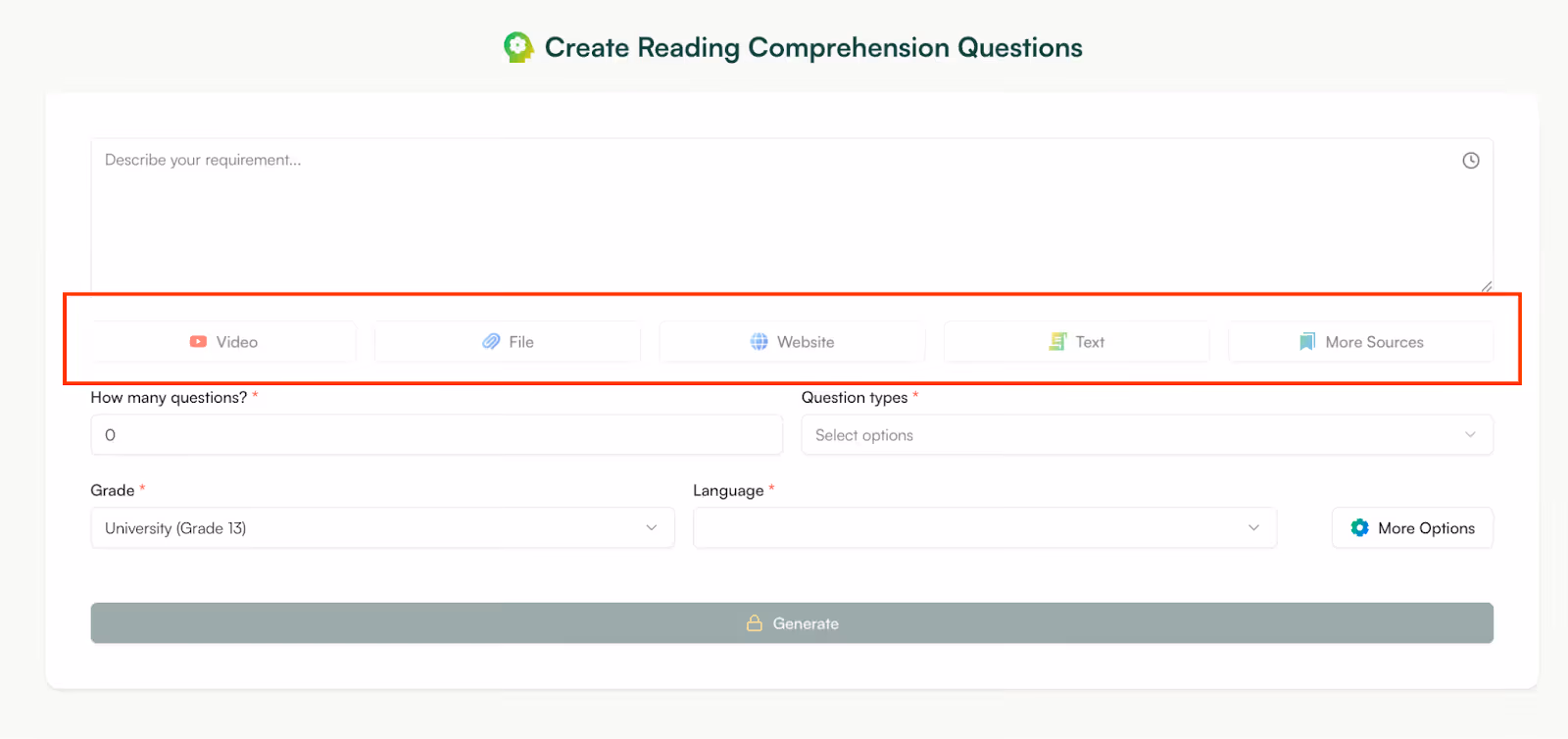With Monsha, that same starting point becomes one connected workflow. You upload the chapter or link the video, generate a reading passage, create comprehension questions from it, turn the same source into slides, and refine everything in one place.